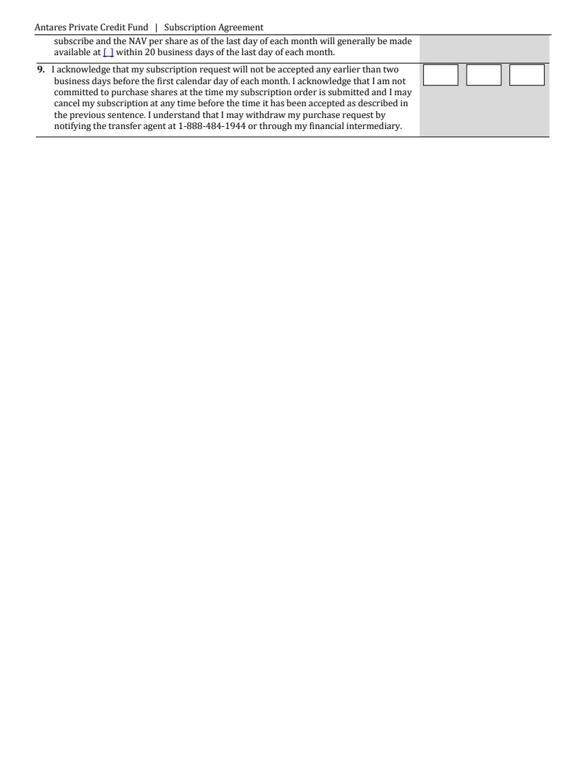 Antares Private Credit Fund | Subscription Agreement subscribe and the NAV per share as of the last day of each month will generally be made available at [ ] within 20 business days of the last day of each month. 9. I acknowledge that my subscription request will not be accepted any earlier than two business days before the first calendar day of each month. I acknowledge that I am not committed to purchase shares at the time my subscription order is submitted and I may cancel my subscription at any time before the time it has been accepted as described in the previous sentence. I understand that I may withdraw my purchase request by notifying the transfer agent at 1-888-484-1944 or through my financial intermediary. |