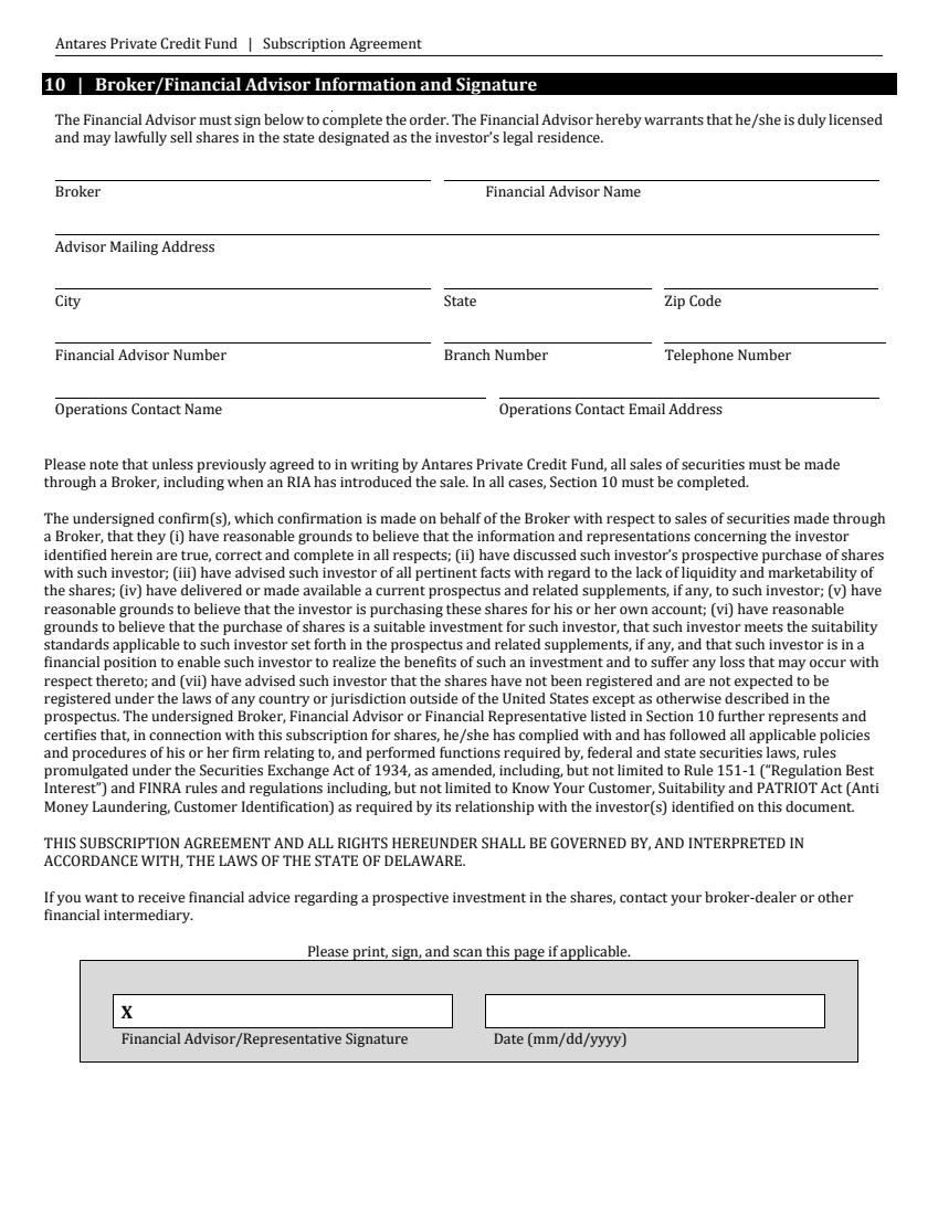 Antares Private Credit Fund | Subscription Agreement 10 | Broker/Financial Advisor Information and Signature The Financial Advisor must sign below to complete the order. The Financial Advisor hereby warrants that he/she is duly licensed and may lawfully sell shares in the state designated as the investor’s legal residence. Broker Financial Advisor Name Advisor Mailing Address City State Zip Code Financial Advisor Number Branch Number Telephone Number Operations Contact Name Operations Contact Email Address Please note that unless previously agreed to in writing by Antares Private Credit Fund, all sales of securities must be made through a Broker, including when an RIA has introduced the sale. In all cases, Section 10 must be completed. The undersigned confirm(s), which confirmation is made on behalf of the Broker with respect to sales of securities made through a Broker, that they (i) have reasonable grounds to believe that the information and representations concerning the investor identified herein are true, correct and complete in all respects; (ii) have discussed such investor’s prospective purchase of shares with such investor; (iii) have advised such investor of all pertinent facts with regard to the lack of liquidity and marketability of the shares; (iv) have delivered or made available a current prospectus and related supplements, if any, to such investor; (v) have reasonable grounds to believe that the investor is purchasing these shares for his or her own account; (vi) have reasonable grounds to believe that the purchase of shares is a suitable investment for such investor, that such investor meets the suitability standards applicable to such investor set forth in the prospectus and related supplements, if any, and that such investor is in a financial position to enable such investor to realize the benefits of such an investment and to suffer any loss that may occur with respect thereto; and (vii) have advised such investor that the shares have not been registered and are not expected to be registered under the laws of any country or jurisdiction outside of the United States except as otherwise described in the prospectus. The undersigned Broker, Financial Advisor or Financial Representative listed in Section 10 further represents and certifies that, in connection with this subscription for shares, he/she has complied with and has followed all applicable policies and procedures of his or her firm relating to, and performed functions required by, federal and state securities laws, rules promulgated under the Securities Exchange Act of 1934, as amended, including, but not limited to Rule 151-1 (“Regulation Best Interest”) and FINRA rules and regulations including, but not limited to Know Your Customer, Suitability and PATRIOT Act (Anti Money Laundering, Customer Identification) as required by its relationship with the investor(s) identified on this document. THIS SUBSCRIPTION AGREEMENT AND ALL RIGHTS HEREUNDER SHALL BE GOVERNED BY, AND INTERPRETED IN ACCORDANCE WITH, THE LAWS OF THE STATE OF DELAWARE. If you want to receive financial advice regarding a prospective investment in the shares, contact your broker-dealer or other financial intermediary. Please print, sign, and scan this page if applicable. X Financial Advisor/Representative Signature Date (mm/dd/yyyy) |